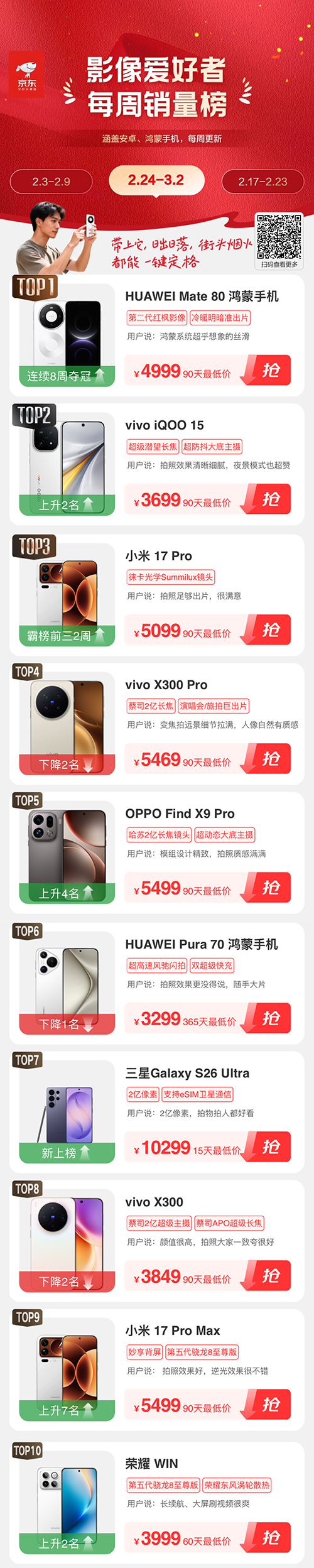 2月24日至3月2日“影像爱好者每周手机销量榜”TOP10依次是华为Mate 80、iQOO 15、小米17 Pro、vivo X300 Pro、OPPO Find X9 Pro、华为Pura 70、三星Galaxy S26 Ultra、vivo X300、小米17 Pro Max、荣耀WIN。其中,华为Mate 80夺冠8周,iQOO 15上升2名,跻身前三。