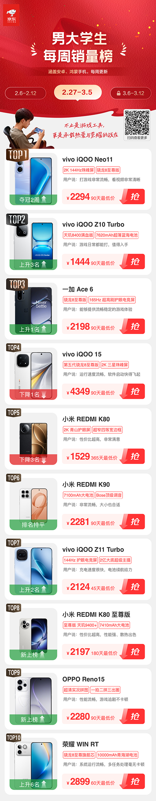 2月27日至3月5日“男大学生每周手机销量榜”TOP10依次是iQOO Neo11、iQOO Z10 Turbo、一加 Ace 6、iQOO 15、REDMI K80、REDMI K90、iQOO Z11 Turbo、REDMI K80至尊版、OPPO Reno15、荣耀WIN RT。其中,REDMI K80至尊版、OPPO Reno15新上榜。
