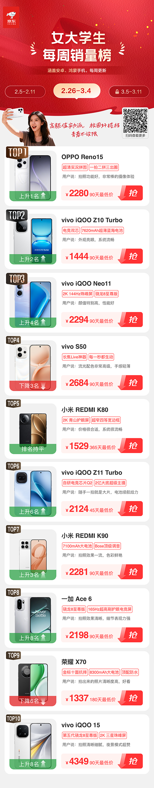 2月26日至3月4日“女大学生每周手机销量榜”TOP10依次是OPPO Reno15、iQOO Z10 Turbo、iQOO Neo11、vivo S50、REDMI K80、iQOO Z11 Turbo、REDMI K90、一加 Ace 6、荣耀X70、iQOO 15。其中,OPPO Reno15上升1名,iQOO Z10 Turbo上升2名,iQOO Neo11上升4名,成为前三名。